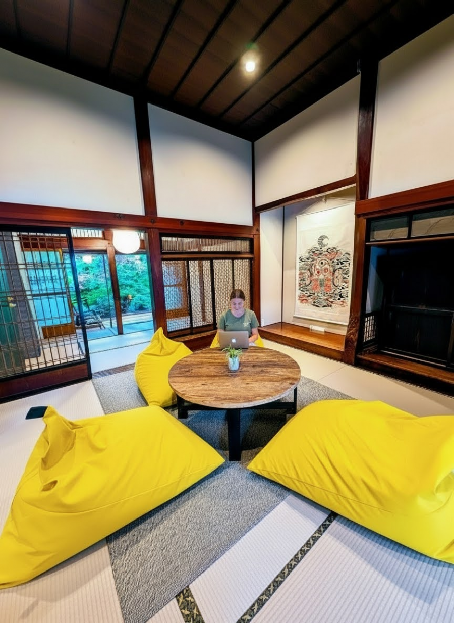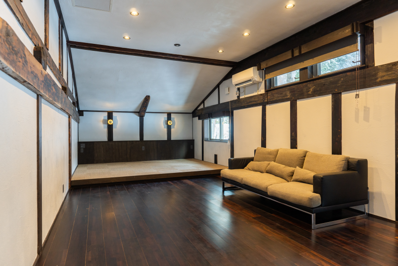 江戸時代の脇本陣の威厳を感じる大きな梁がある共用部には、ワークスペースのほか、プロジェクターとスクリーン、音響設備が標準装備。